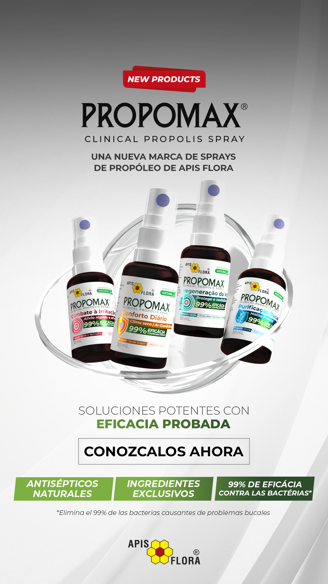 PROPOMAX® se produce con extracto de propóleo 100% verde, obtenido con tecnología exclusiva de Apis Flora, que mantiene la alta concentración de los bioactivos en un producto sin alcohol.