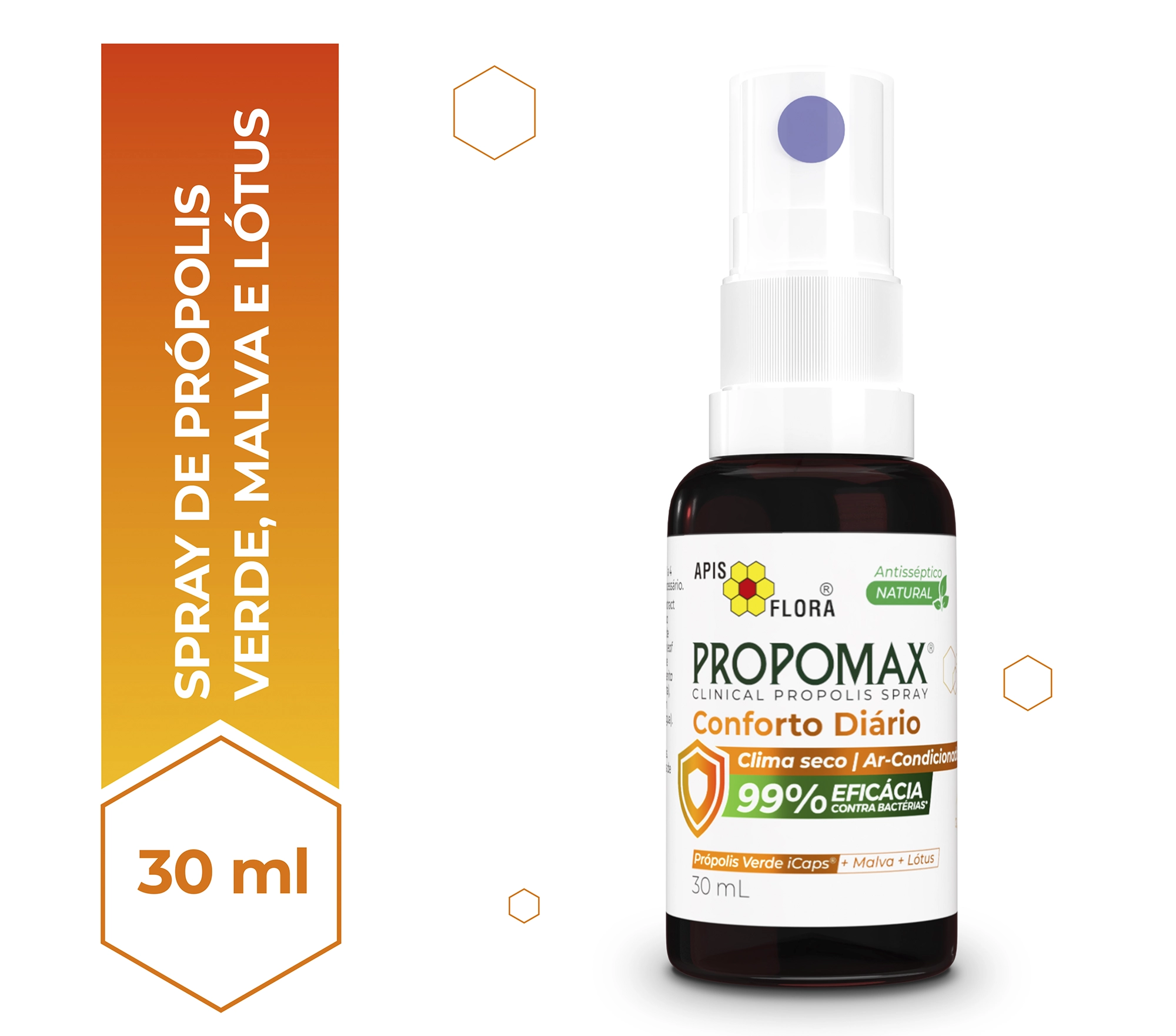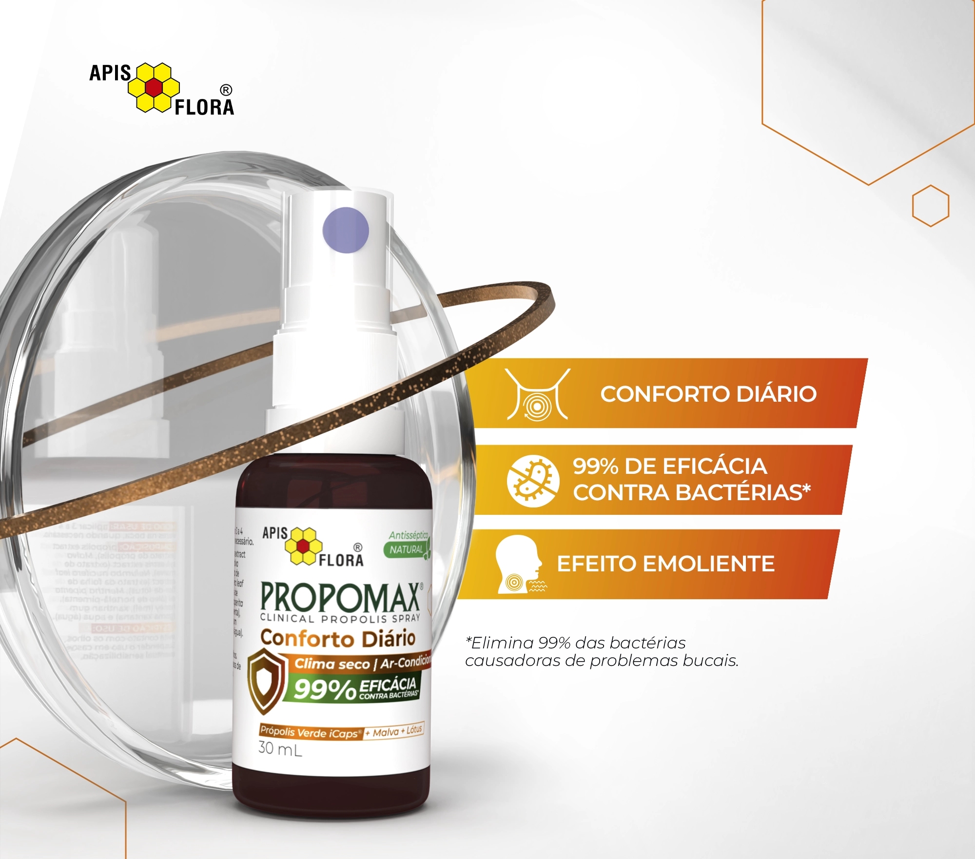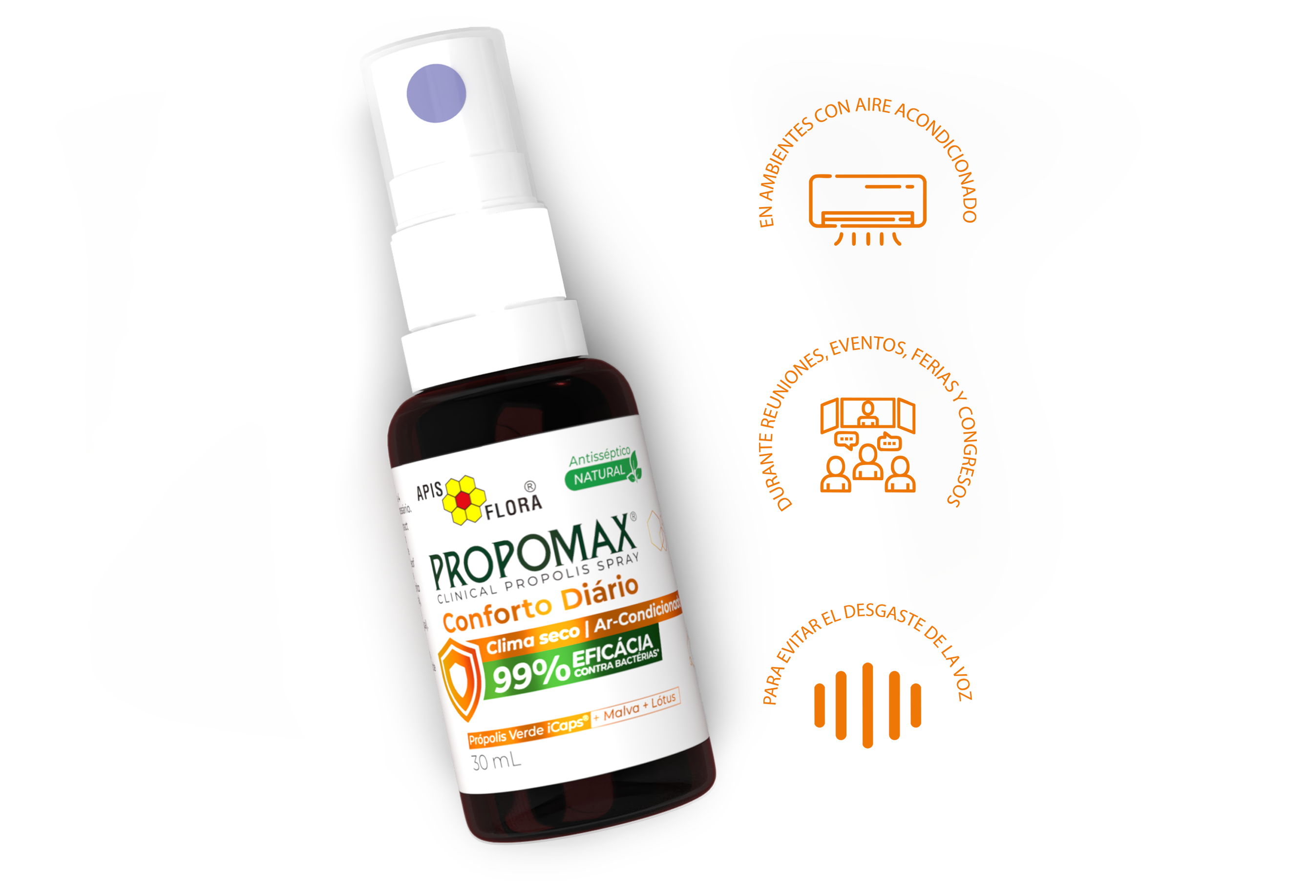 Combinando de manera eficaz el extracto de propóleo verde EPP-AF® iCaps, malva, loto y miel, PROPOMAX® Clinical Conforto Diario ofrece la protección ideal contra los efectos del clima seco y del aire acondicionado, promoviendo hidratación y alivio para la garganta a lo largo del día. La presencia del extracto de propóleo EPP-AF® iCaps en PROPOMAX® Clinical Conforto Diario ofrece una protección prolongada para la garganta, ya que, gracias a su tecnología de microencapsulación, permite una liberación sostenida, aumentando el tiempo de interacción con el organismo y prolongando su efecto.
