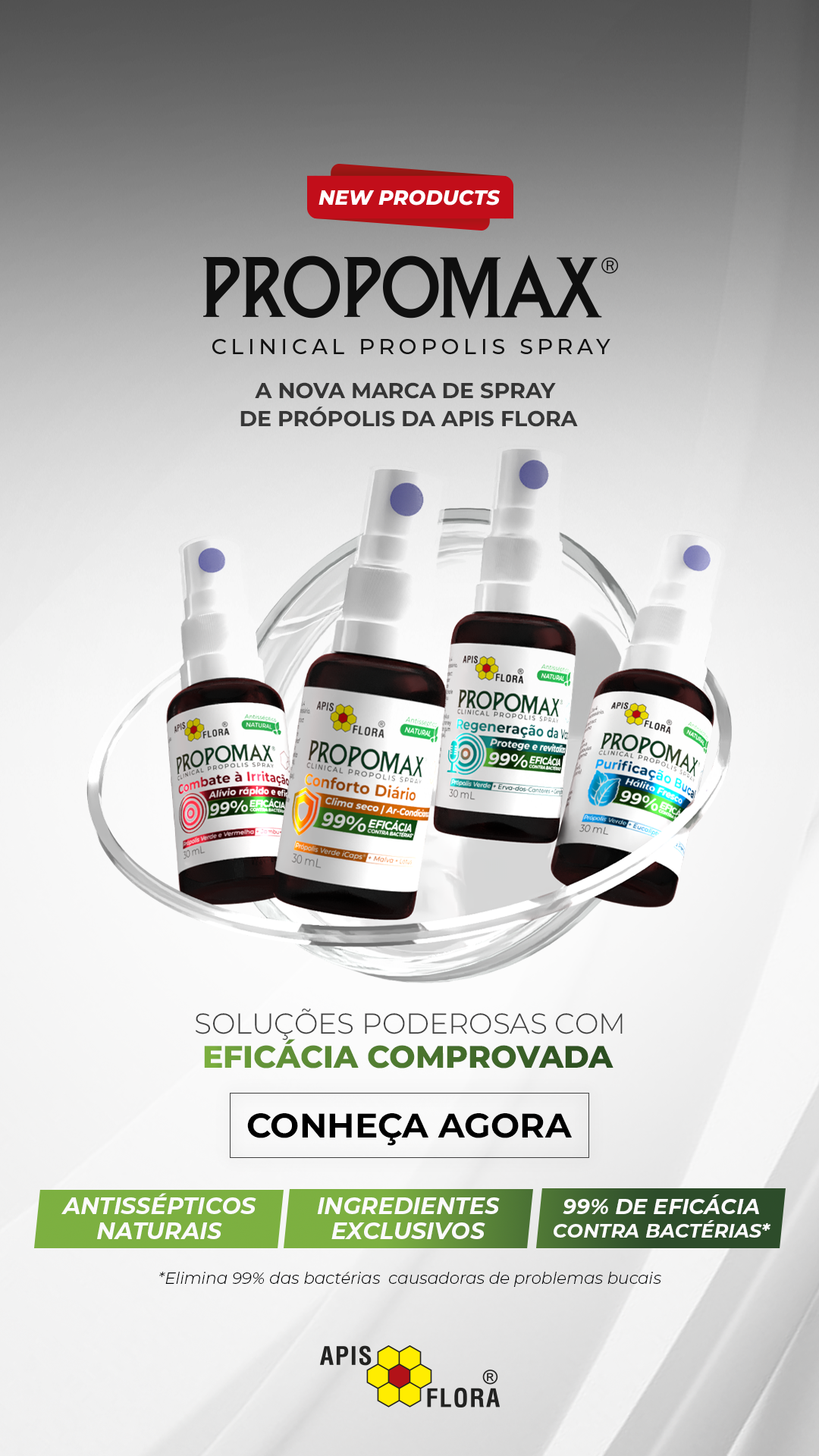 PROPOMAX® é produzido com extrato de própolis 100% verde, obtido com tecnologia exclusiva da Apis Flora, que mantém a alta concentração dos bioativos em um produto sem álcool.