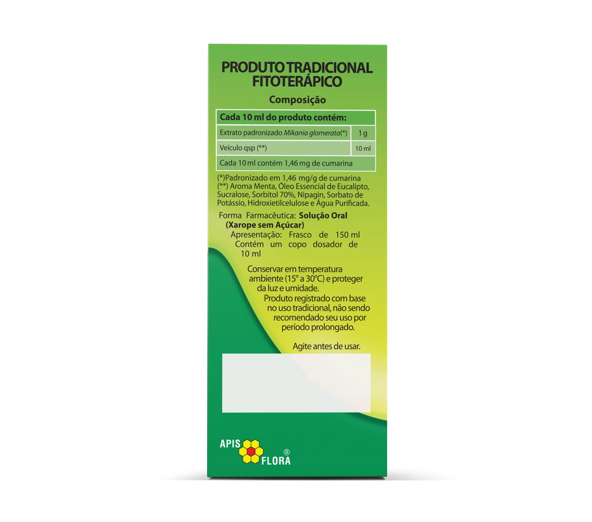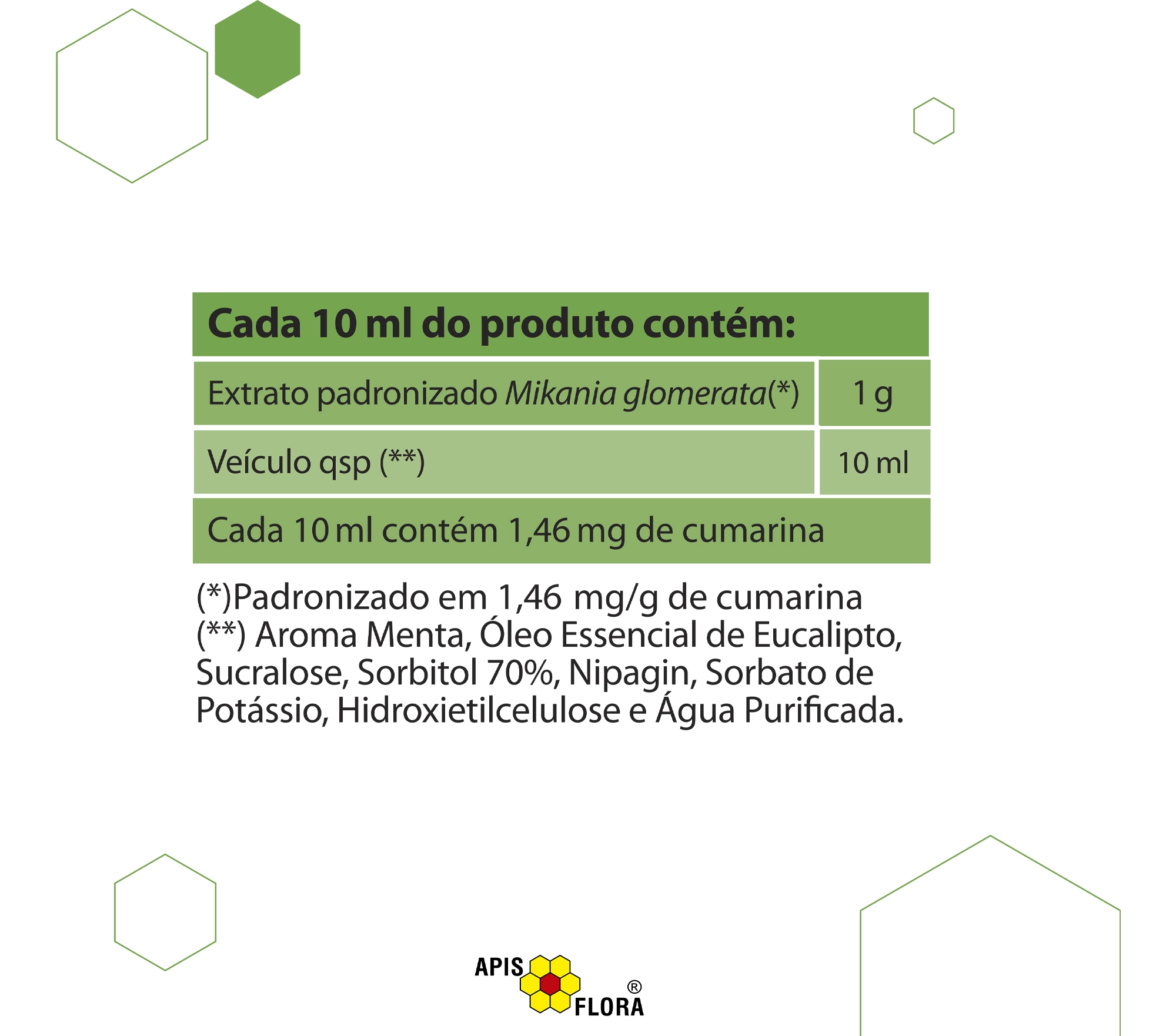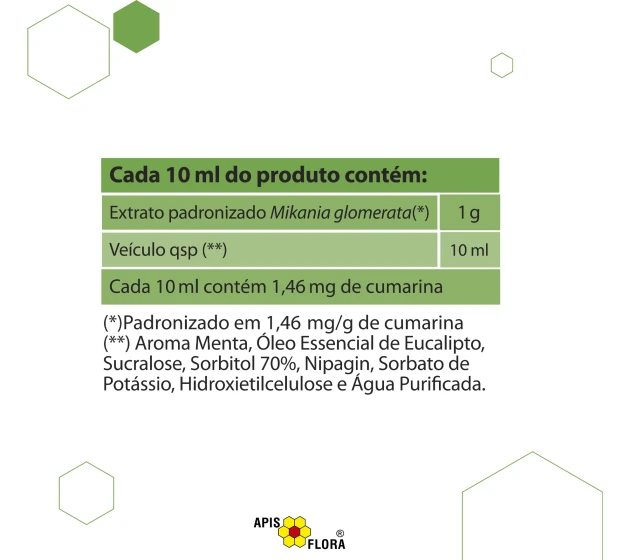 Cada 10 ml do produto contém: 1 g de extrato padronizado de guaco (Mikania glomerata)*. Veículo qsp: aroma de menta, óleo essencial de eucalipto, sucralose, sorbitol 70%, nipagin, sorbato de potássio, hidroxietilcelulose e água purificada.