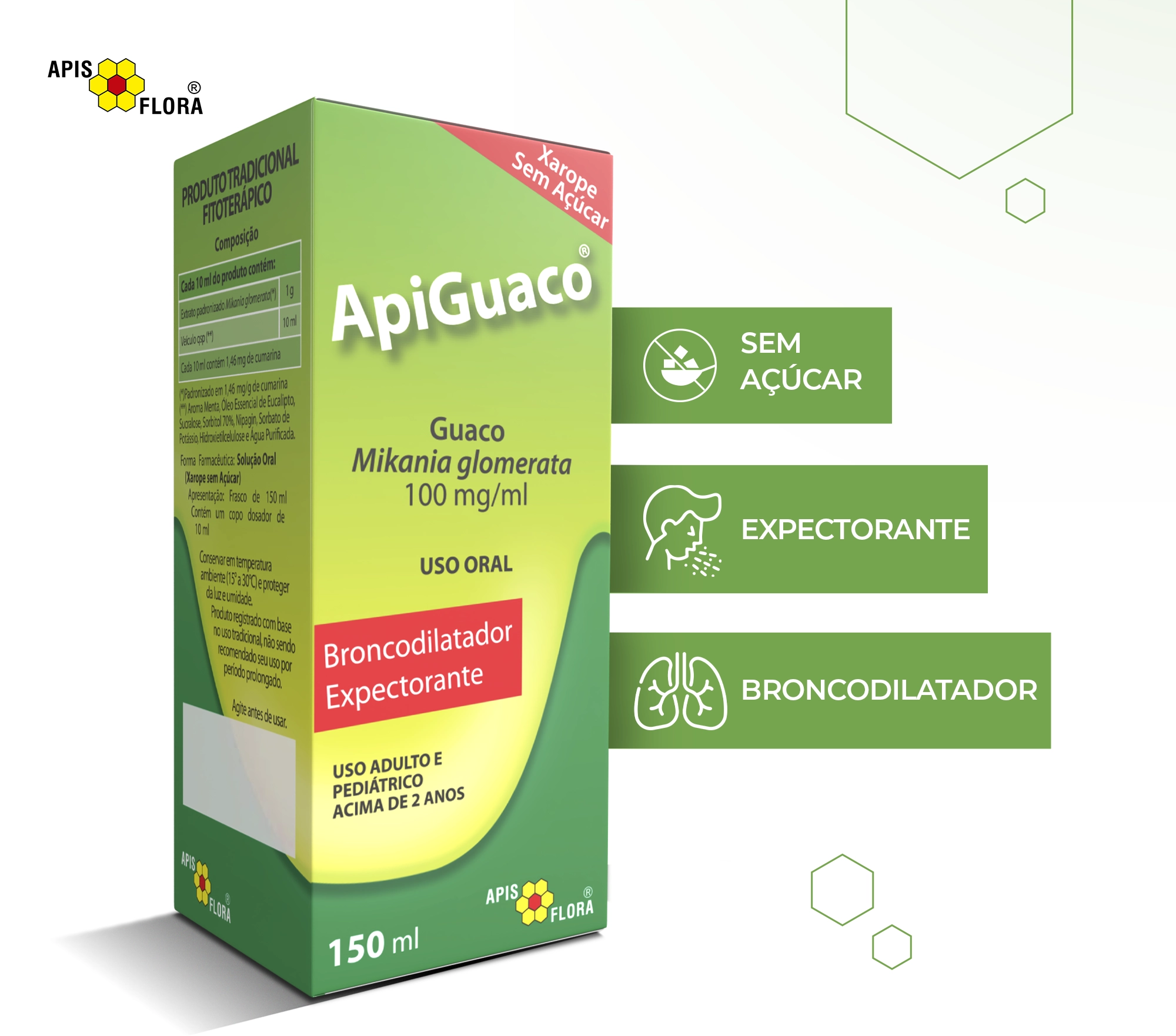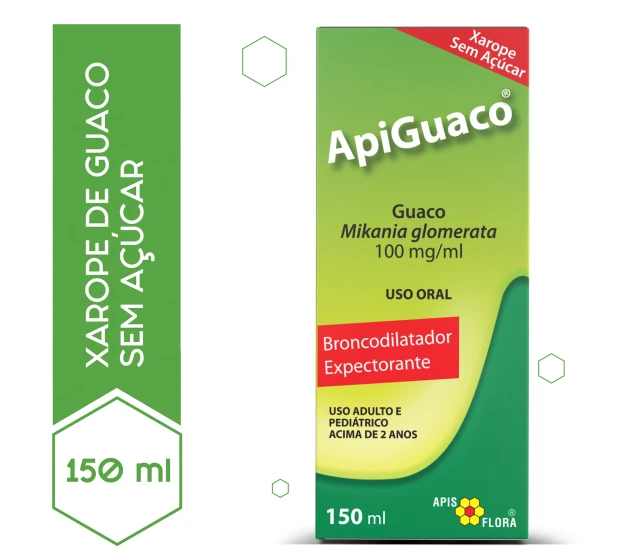 APIGUACO® - EDULITO 150 ml - Mikania glomerata - Registro M.S.: 1.2107.0009.004-0. Indicações: APIGUACO® - EDULITO este medicamento é um xarope expectorante que ajuda na eliminação do catarro em tosses persistentes. O medicamento ainda apresenta atividade broncodilatadora, sendo indicado no alívio do espasmo brônquico associado às crises de asma, bronquite crônica e enfisema. APIGUACO® - EDULITO - É UM MEDICAMENTO. SEU USO PODE TRAZER RISCOS. PROCURE O MÉDICO E O FARMACÊUTICO. LEIA A BULA.