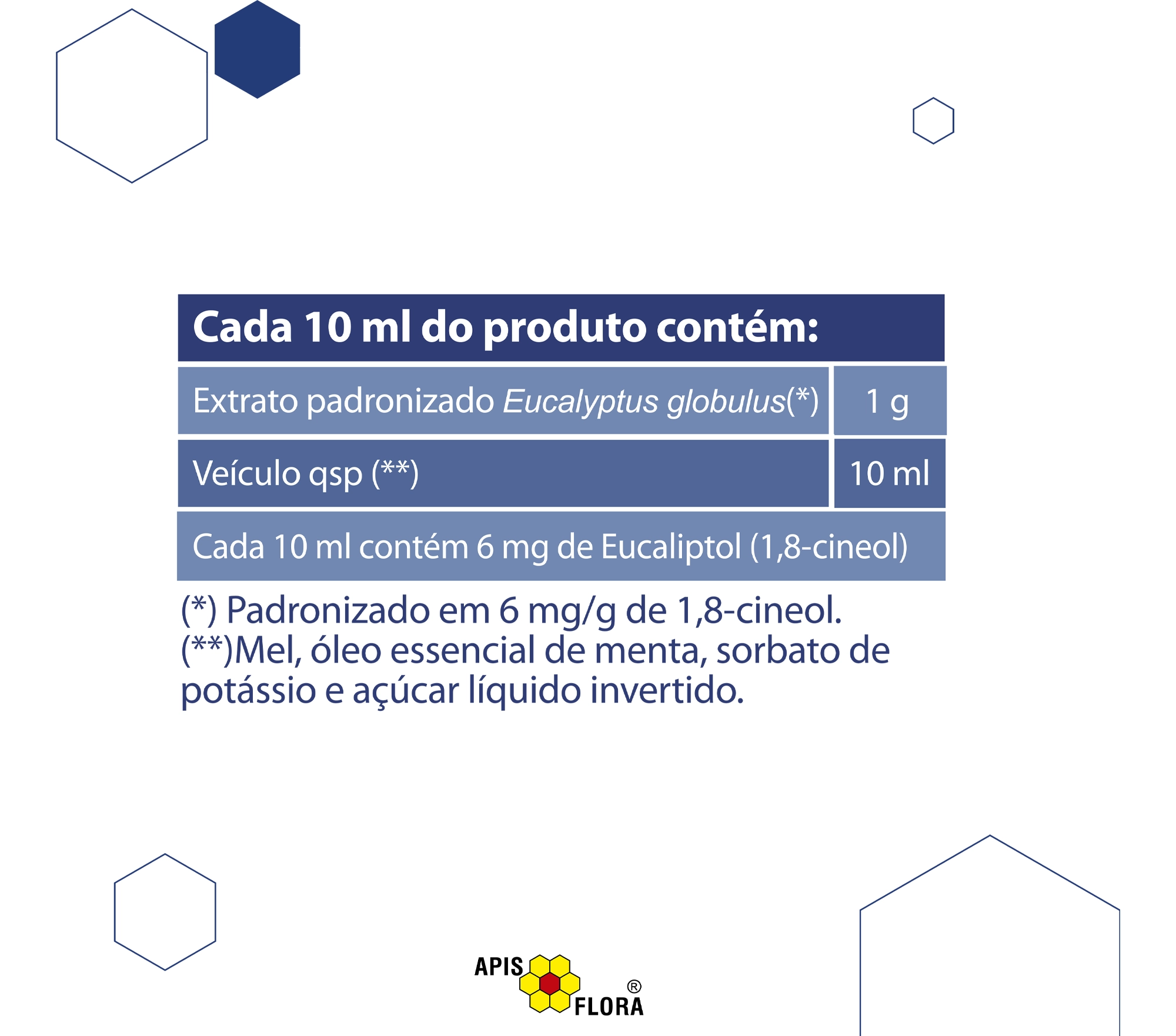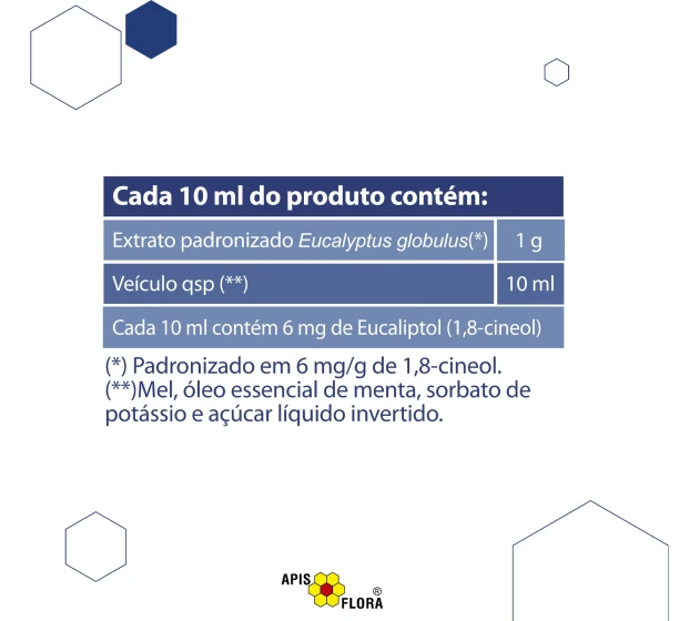 Cada 10 ml do produto contém: 1 g de extrato padronizado de eucalipto (Eucalyptus globulus)*. Veículo qsp: mel, óleo essencial de menta, sorbato de potássio e açúcar líquido invertido.