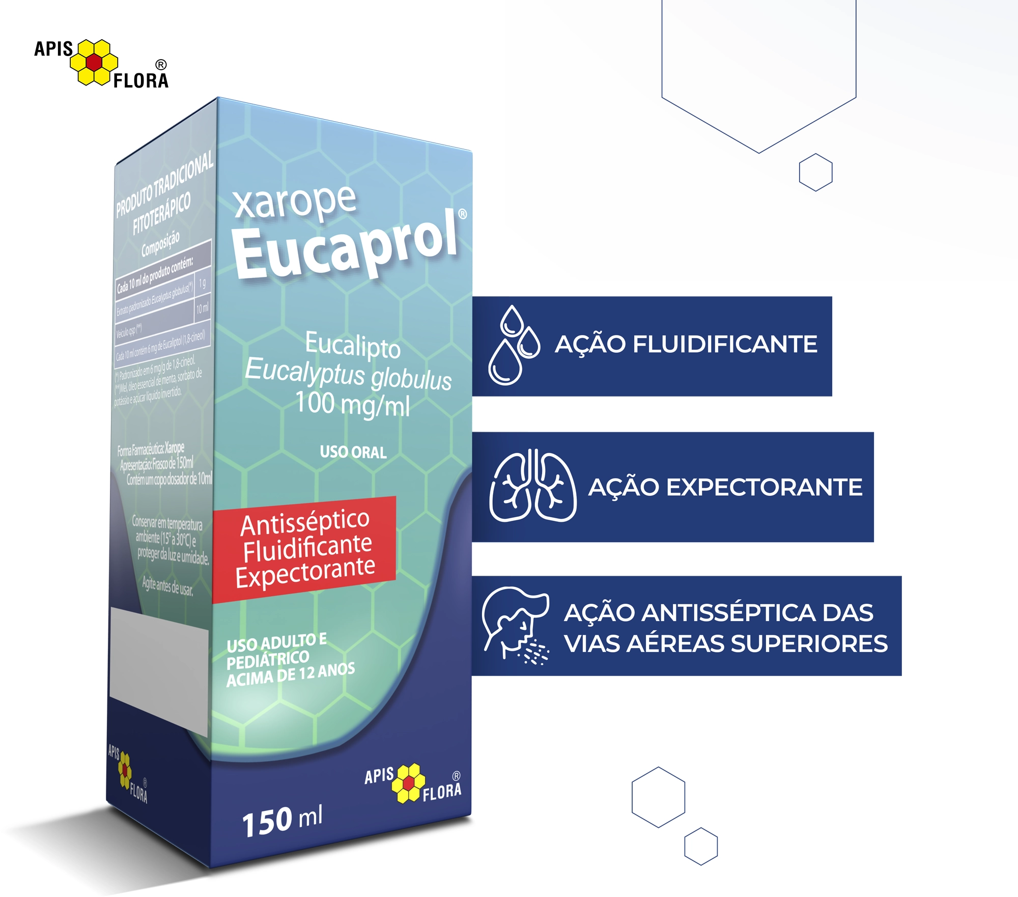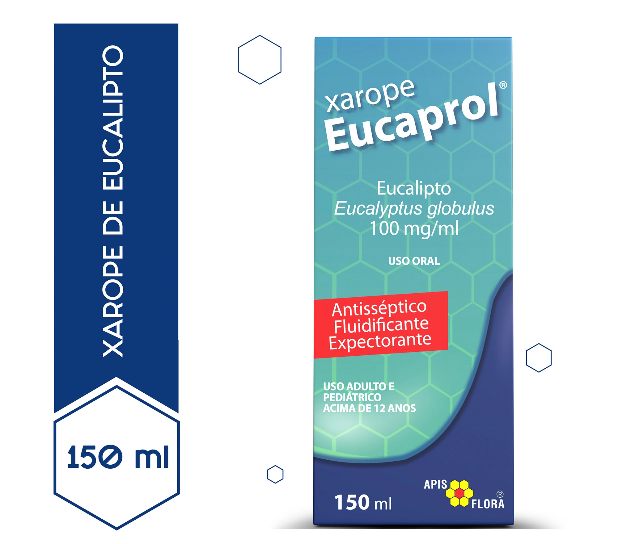 EUCAPROL® - XAROPE 150ml - Eucalyptus globulus - Registro M.S: 1.2107.0010.001-1 Indicação: EUCAPROL® - XAROPE. Este medicamento é indicado como expectorante, antisséptico e antibacteriano das vias aéreas superiores. EUCAPROL® - XAROPE É UM MEDICAMENTO. SEU USO PODE TRAZER RISCOS. PROCURE O MÉDICO E O FARMACÊUTICO. LEIA A BULA.