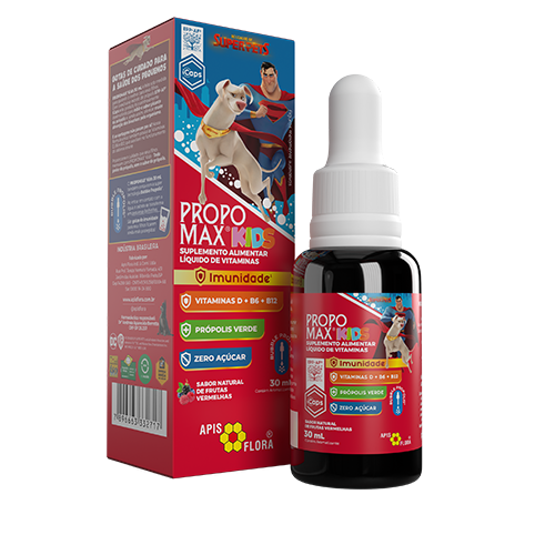 O PROPOMAX® Kids 140 ml é um extrato de própolis EPP-AF® iCAPS com vitaminas D, B6 e B12, o que faz dele um excelente auxiliar para o funcionamento do sistema imune. Pronto para uso e com delicioso sabor frutas vermelhas, ele é uma solução prática para dar aquele up na imunidade dos pequenos.