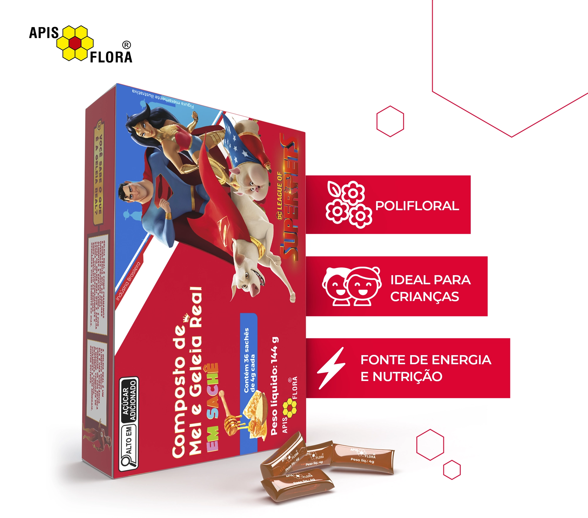 A apresentação é a medida ideal para crianças, associando de maneira única a energia do mel, com as vitaminas, sais minerais e aminoácidos da geleia real.