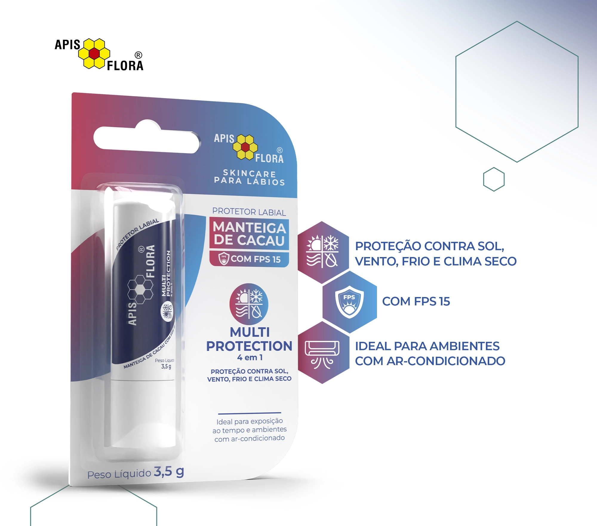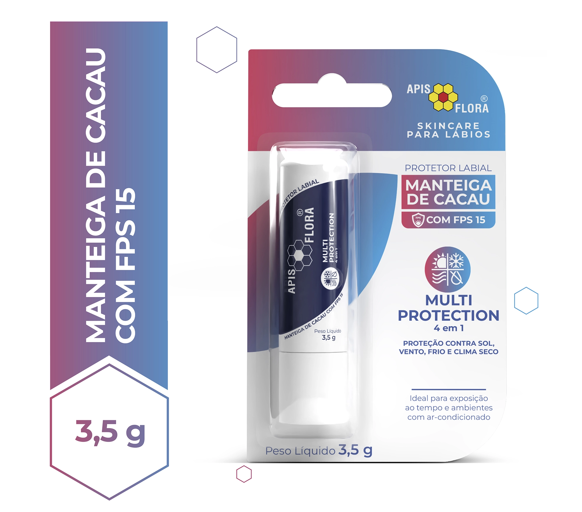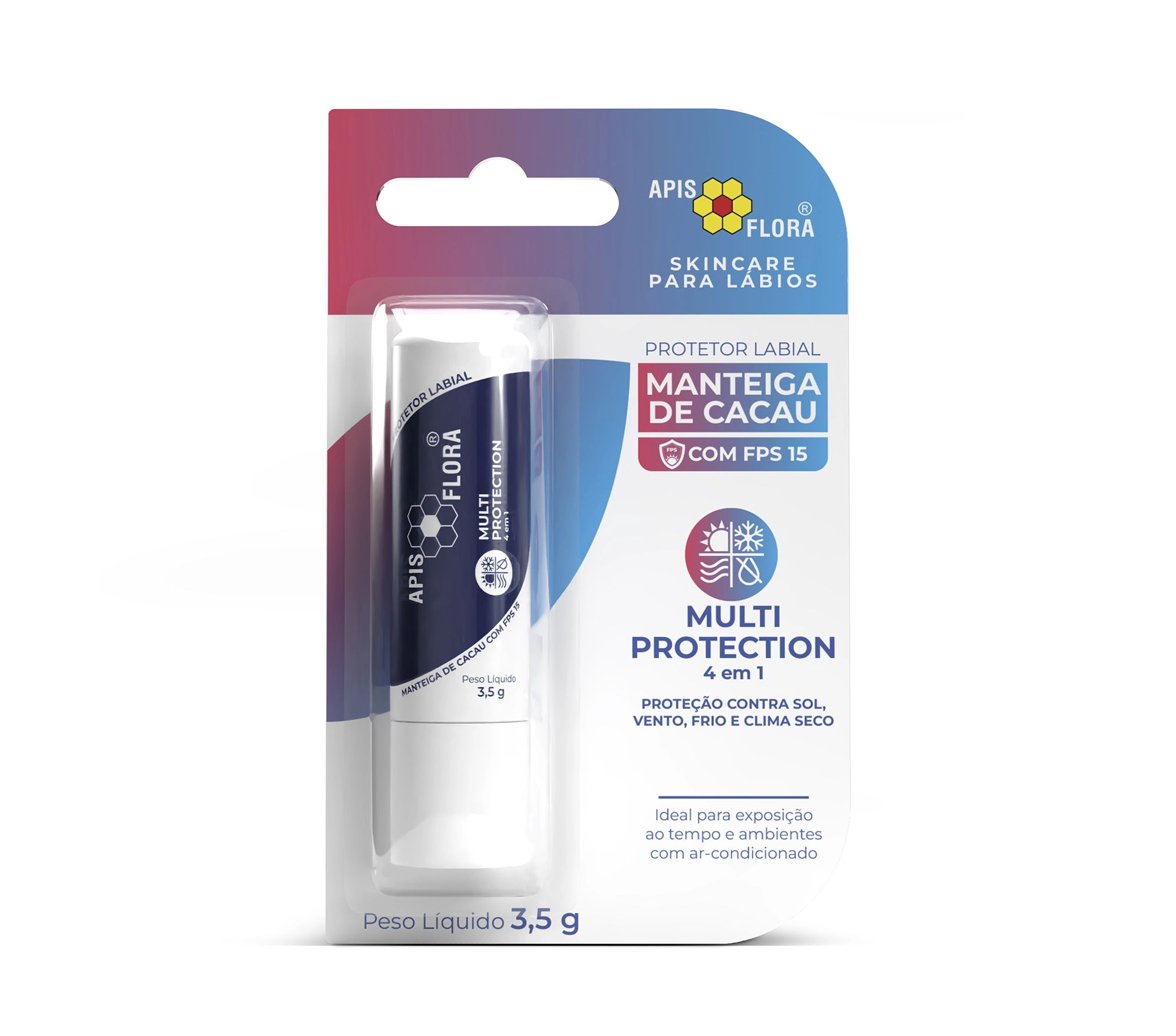 Multi Protection é um protetor labial com manteiga de cacau, extrato de própolis e FPS 15, ideal para manter os lábios saudáveis, macios e protegidos no dia a dia.