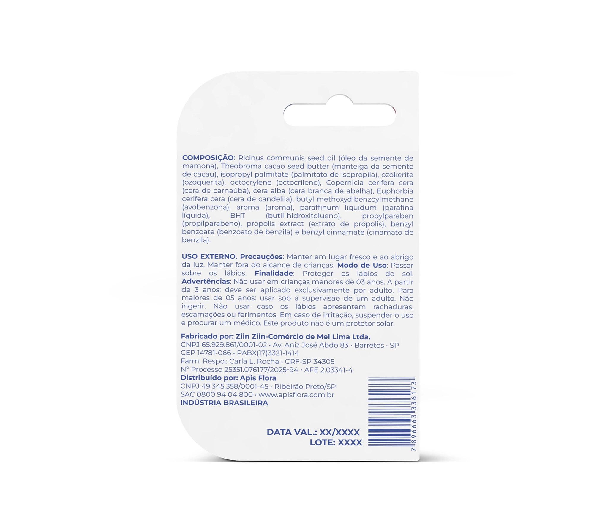 Ricinus communis seed oil (óleo da semente de mamona), Theobroma cacao seed butter (manteiga da semente de cacau), isopropyl palmitate (palmitato de isopropila), ozokerite (ozoquerita), octocrylene (octocrileno), Copernicia cerifera cera (cera de carnaúba), cera alba (cera branca de abelha), Euphorbia cerifera cera (cera de candelila), butylmethoxydibenzoylmethane (avobenzona), aroma (aroma), paraffinum liquidum (parafina líquida), BHT (butil-hidroxitolueno), propylparaben (propilparabeno), propolis extract (extrato de própolis), benzyl benzoate (benzoato de benzila) e benzyl cinnamate (cinamato de benzila).