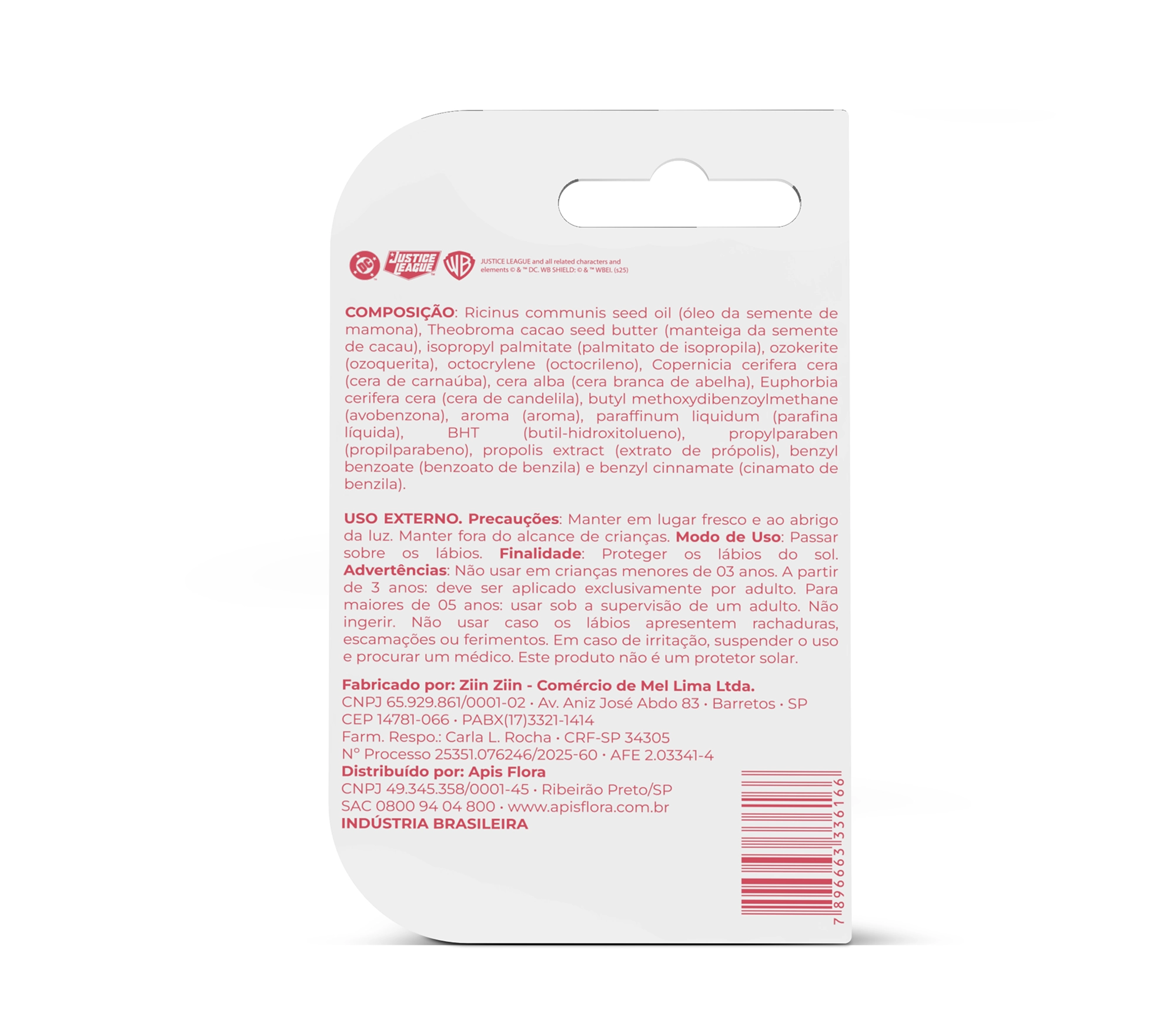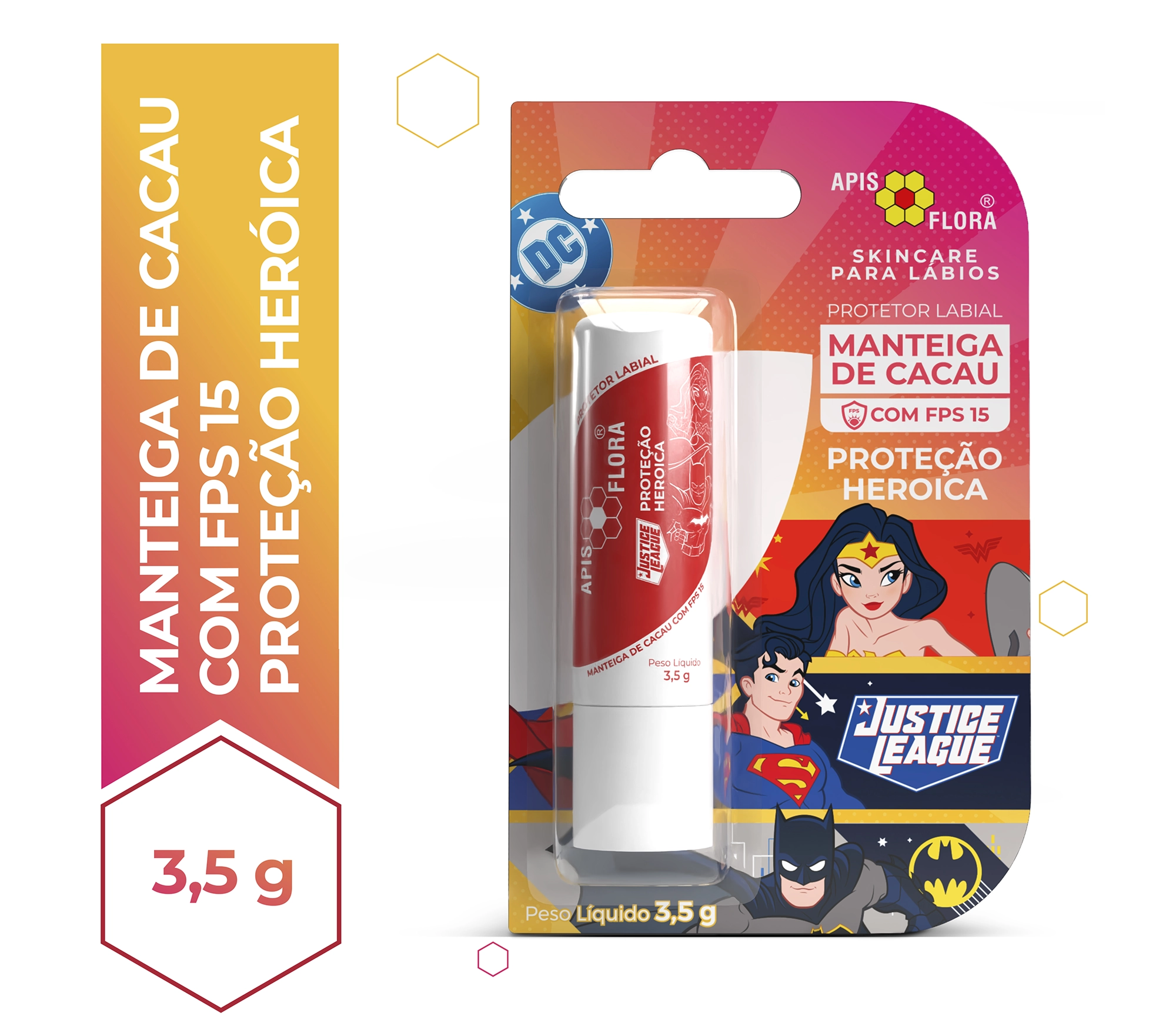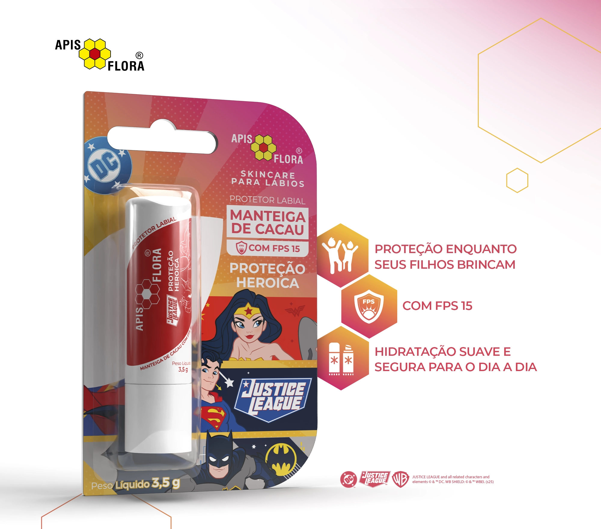 Proteção Heroica é um protetor labial com manteiga de cacau, extrato de própolis e FPS 15, feito especialmente para cuidar dos lábios das crianças.
